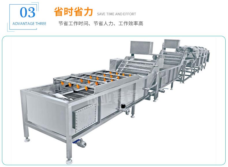 流水線采用食品級材料安全可靠、無污染。輸送平穩,速度可調,將前道整理去雜等工序切割完畢的蔬菜通過強力鼓泡、水流沖浪、翻轉、高壓噴淋等清洗方式,從而使蔬菜更潔凈,更清脆,并延長蔬菜的儲存時間。將帶有水的蔬菜震動風干脫水后再做即可自動裝筐、稱重、包裝入庫。  該流水線適用于:蔬菜、水產品等顆粒狀、葉狀、根莖類產品的清洗等。